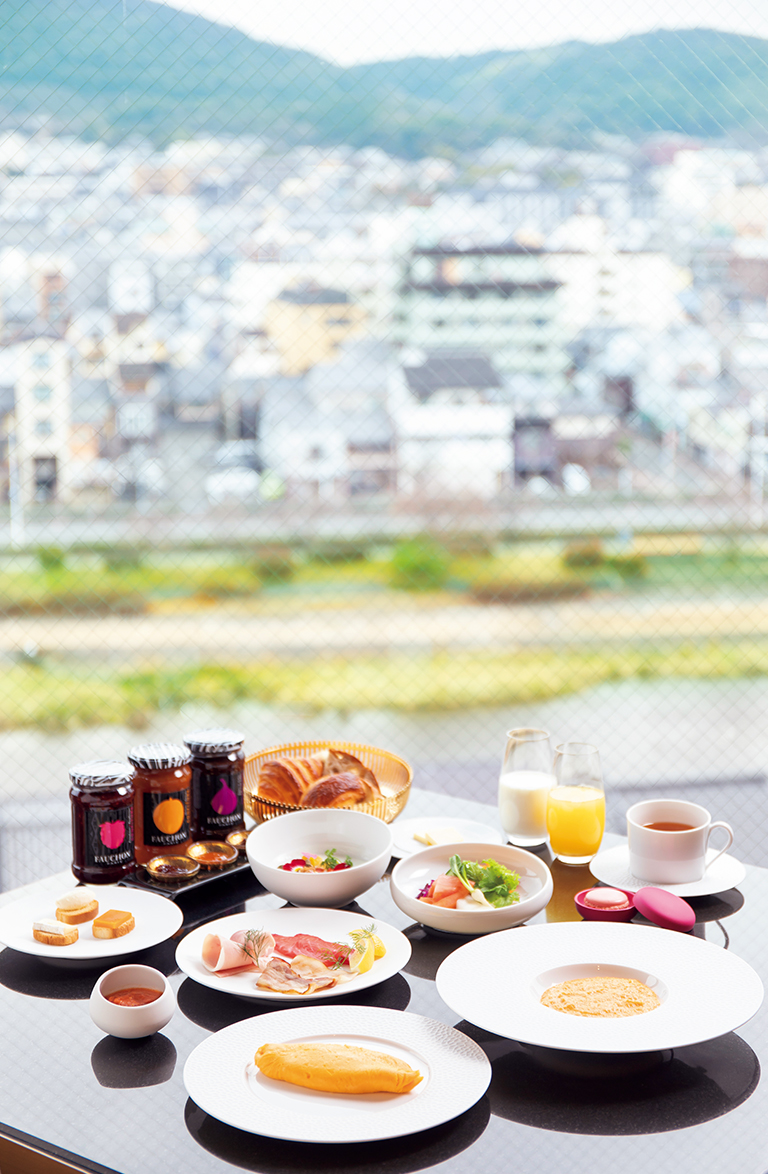同ホテルのコンセプトは「FAUCHONMeets Kyoto. Feel Paris.」。最上階のレストランでは、パリ仕込みのレシピと京都の風土に育まれた食材から生まれるメニューが味わえる。その日初めての食事であり、チェックアウトの日にはホテルで最後に口にする食事でもある朝食。