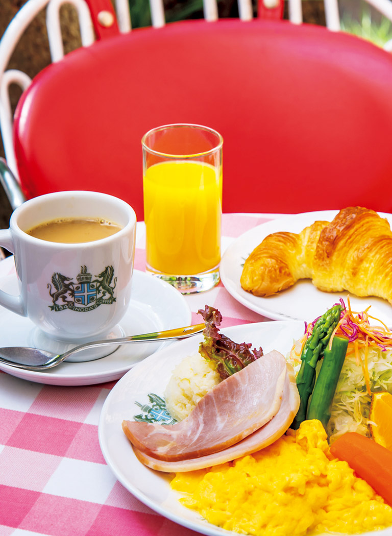 ここでお腹いっぱい召し上がっていただくのも良い思い出になるようです」と業務課長の国本信夫さん。国本さんがおすすめの席は、本館奥の中庭。朝日の注ぐテーブルでは、店内で飼うインコのさえずりも聞こえ、全身で朝の心地良さに浸ることができる。