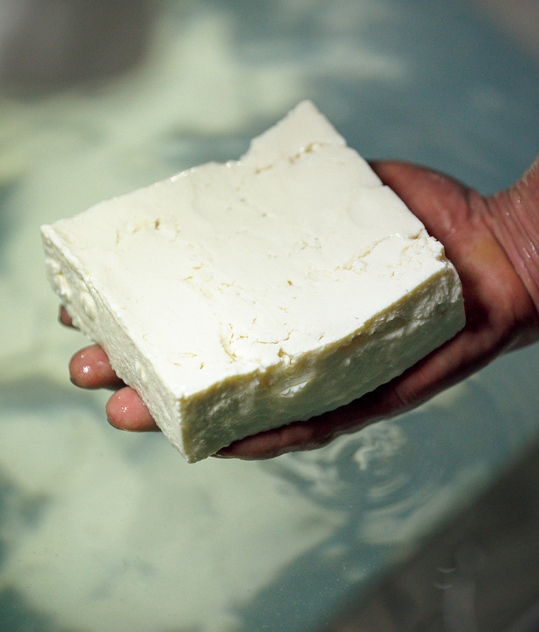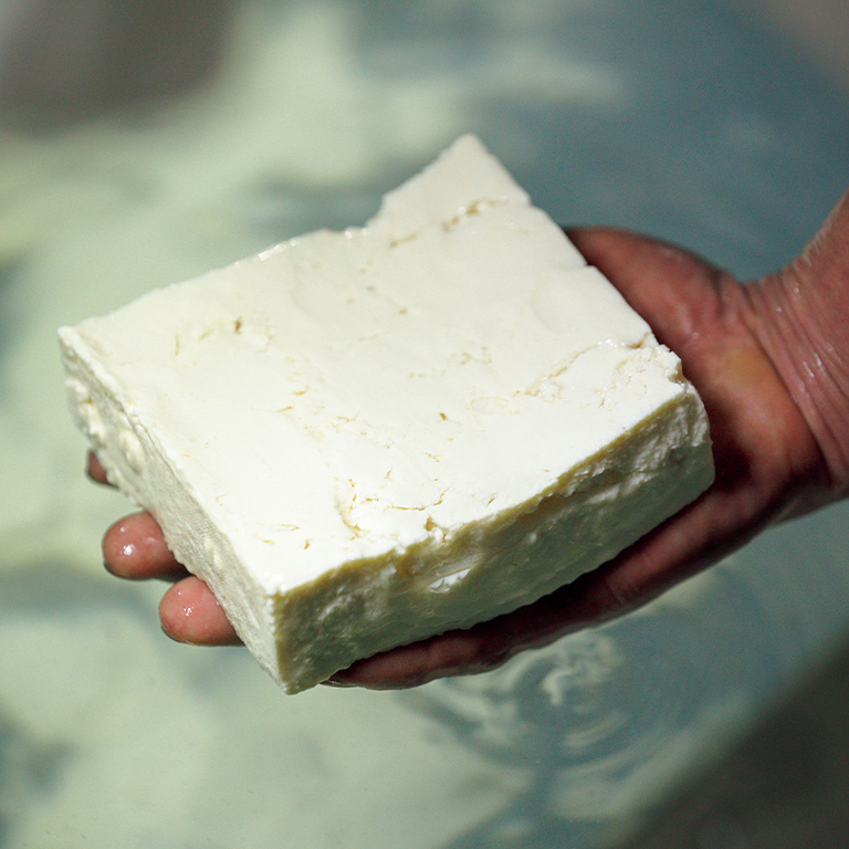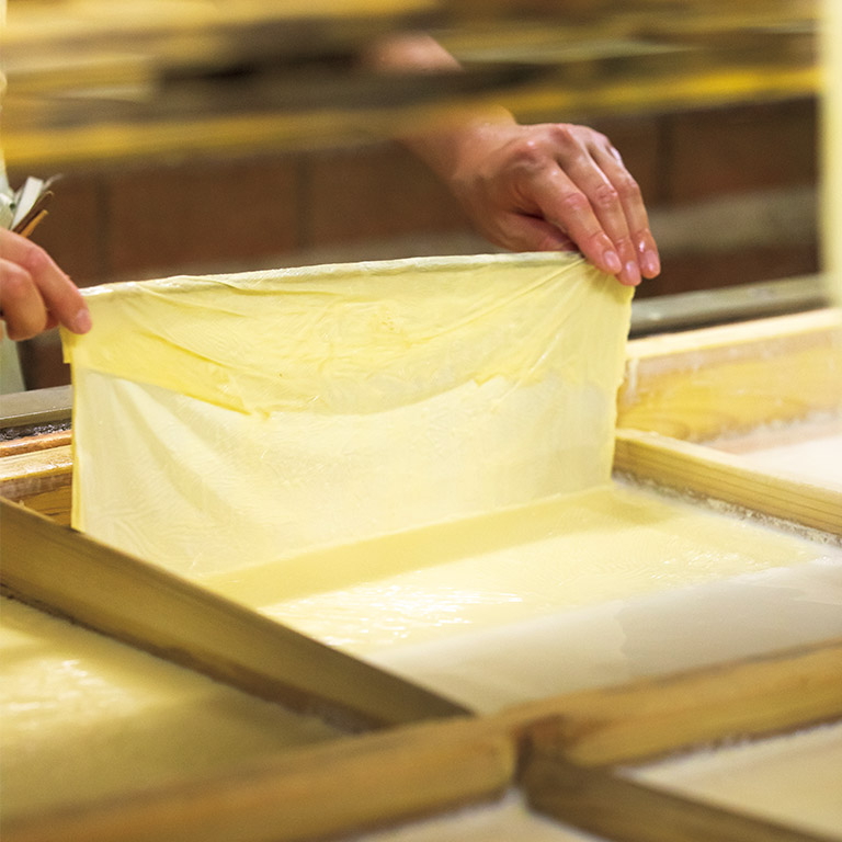 その名水を使った『入山豆腐店』の「白豆腐」は木綿豆腐だが、絹こしと言われても疑わないほどの口当たりだ。「この軟らかさが、昔から京都の豆腐の〝当たり前〞だったんです」と、8代目の入山貴之さん。口に運べば滑らかな舌触りに、大豆本来の豊かな香りと風味が広がる。現在では、より滑らかな豆腐を求める人が多いことから、夏季には寒天を入れてさらに軟らかい食感にした「絹ごし豆腐」も販売している。