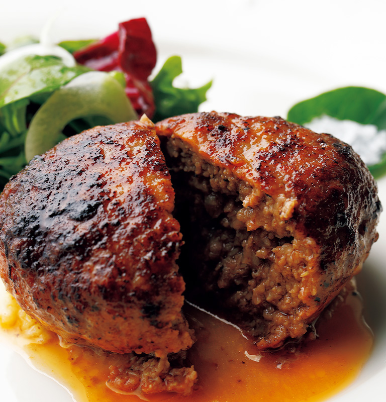 ハンバーグに使用する挽き肉は、ステーキにも使われる黒毛和牛だ。産地やブランドではなく、「枯らし」という日本の伝統的な方法で熟成させた肉にこだわって仕入れている。解体後すぐに冷蔵、骨が付いた枝肉のまま1、2か月保管するこの熟成法により、旨みが凝縮してくると、「和牛香」と呼ばれるコクのある甘い香りが立つ。