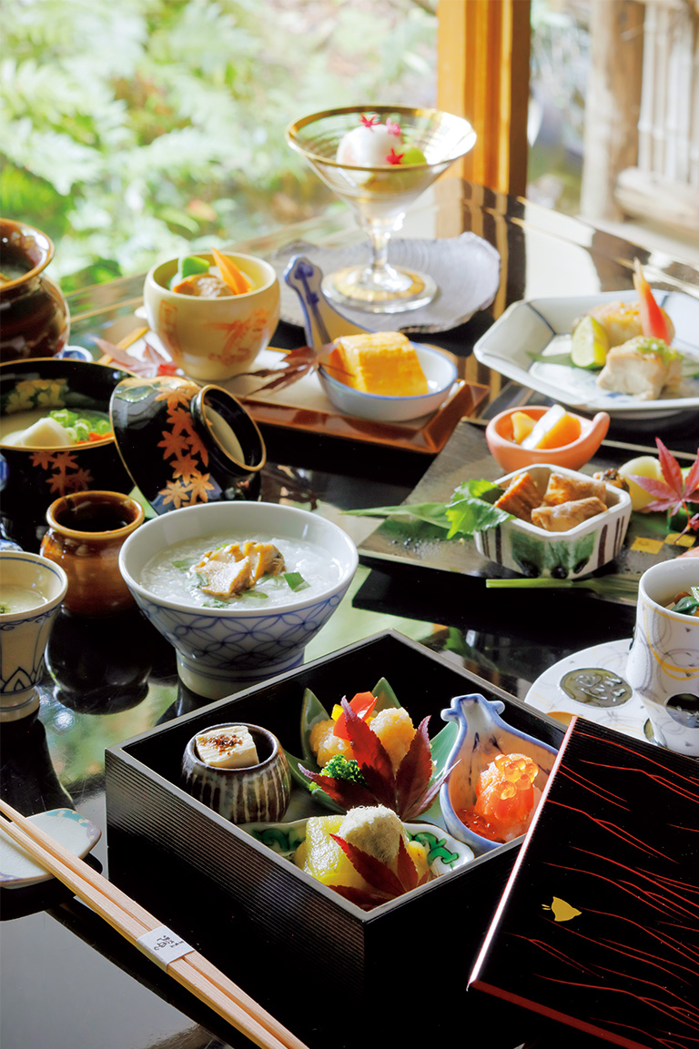 同ホテルでは春と秋の美しい季節、朝一番に寺社を貸切・散策する早朝ツアーを約20年実施するなど、数ある宿泊施設のなかでも地元・京都との結びつきが強いホテルの一つ。旅人と京都を深くつなごうという精神を食にも投影し、京都の旬の味覚を贅沢に盛り込んだ朝餉がある。ホテル1階『京懐石 螢』にて、コース仕立てで供される「螢特別朝食」だ。
