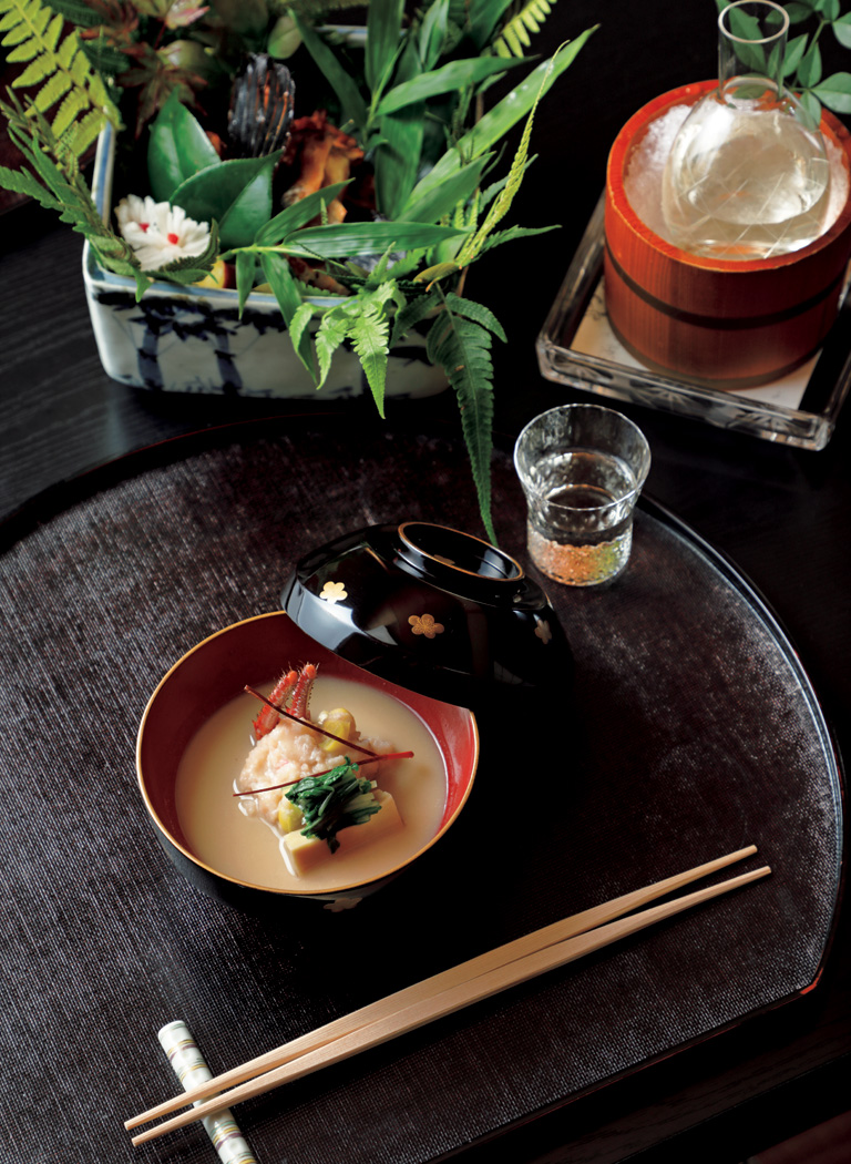 そして椀物は、蓮蒸しの白味噌仕立て。蓮根をすりおろし、伊勢海老と銀杏を蒸し固めた蓮蒸しの上品な旨み、濃厚ながら後口の良い白味噌がお腹をじわっと温めてくれる。