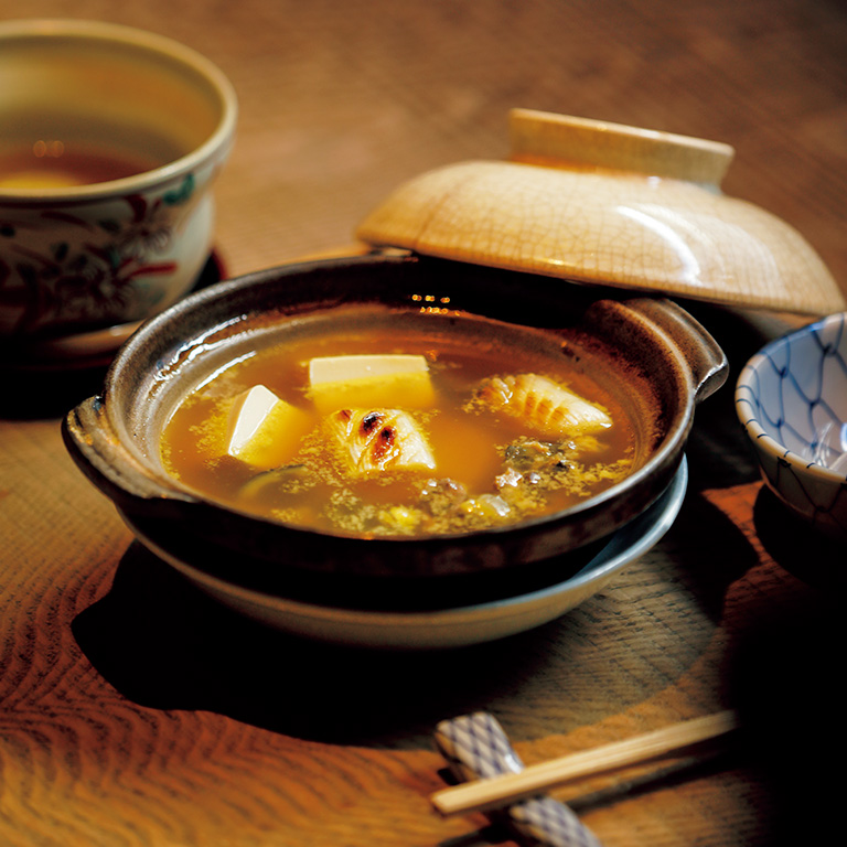 赤身が強くきめ細かいサシが特徴の近江牛は融点が低く、それゆえ口当たりがよいという。添えられるのは湖塩を昆布出汁で割って固めた特製の泡塩だ。