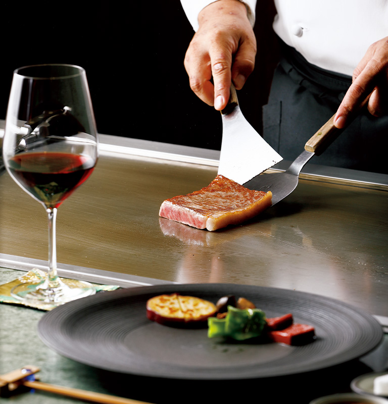 そんなこだわりの肉を存分に堪能するなら、ステーキをはじめ、八寸・椀物・揚げ物など、すべてに近江牛を使った創作コース「ステーキ割烹」を。カウンター席では目の前の鉄板で肉が焼かれ、ジューッという音と香りに期待が膨らむ。
