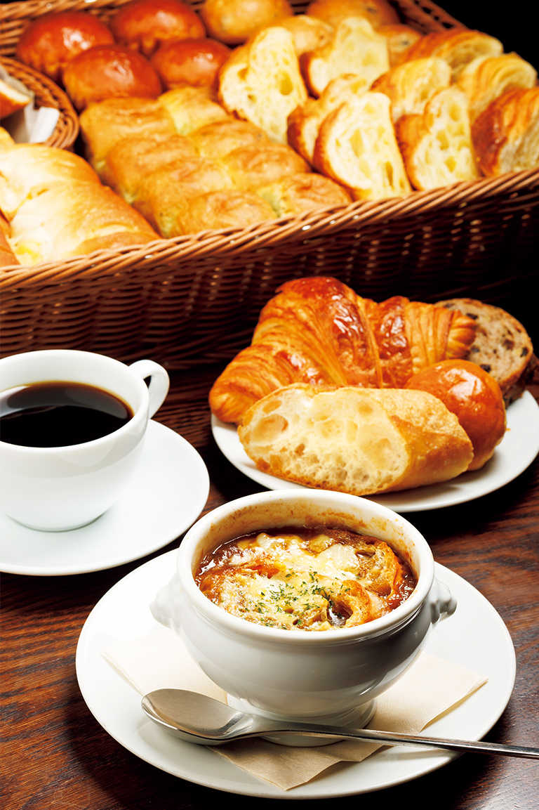 4種類から選べるスープは「パンに合う味」を意識して作られ、「オニオングラタンスープ」はしっかりとしたブイヨンの旨みに胡椒が利き、自然とパンに手が伸びてしまう味わいだ。たっぷり入った飴色の玉ねぎと、スープを含み軟らかくなった薄切りのバゲットの上からとろりと溶けたグリュイエールチーズが絡みつき、幸せなハーモニーを奏でる。