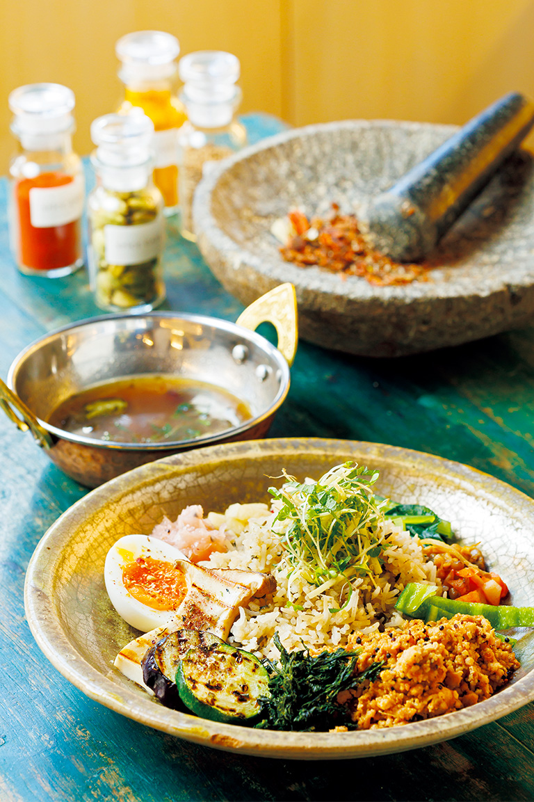 ミュージシャンでもあるオーナーが、全国を旅するなかで出合ったインドの香り米・バスマティライスの美味しさに心を射抜かれ、その味を地元・京都の人にも知ってもらいたいと開業した。この2号店ではバスマティライスを京風出汁の“朝カレー”で提供する。「バスマティライスは日本米と違い糖質が少なく、血糖値の急な上昇を抑えられるので、朝食にもぴったりなんです」とスタッフの仁下さん。