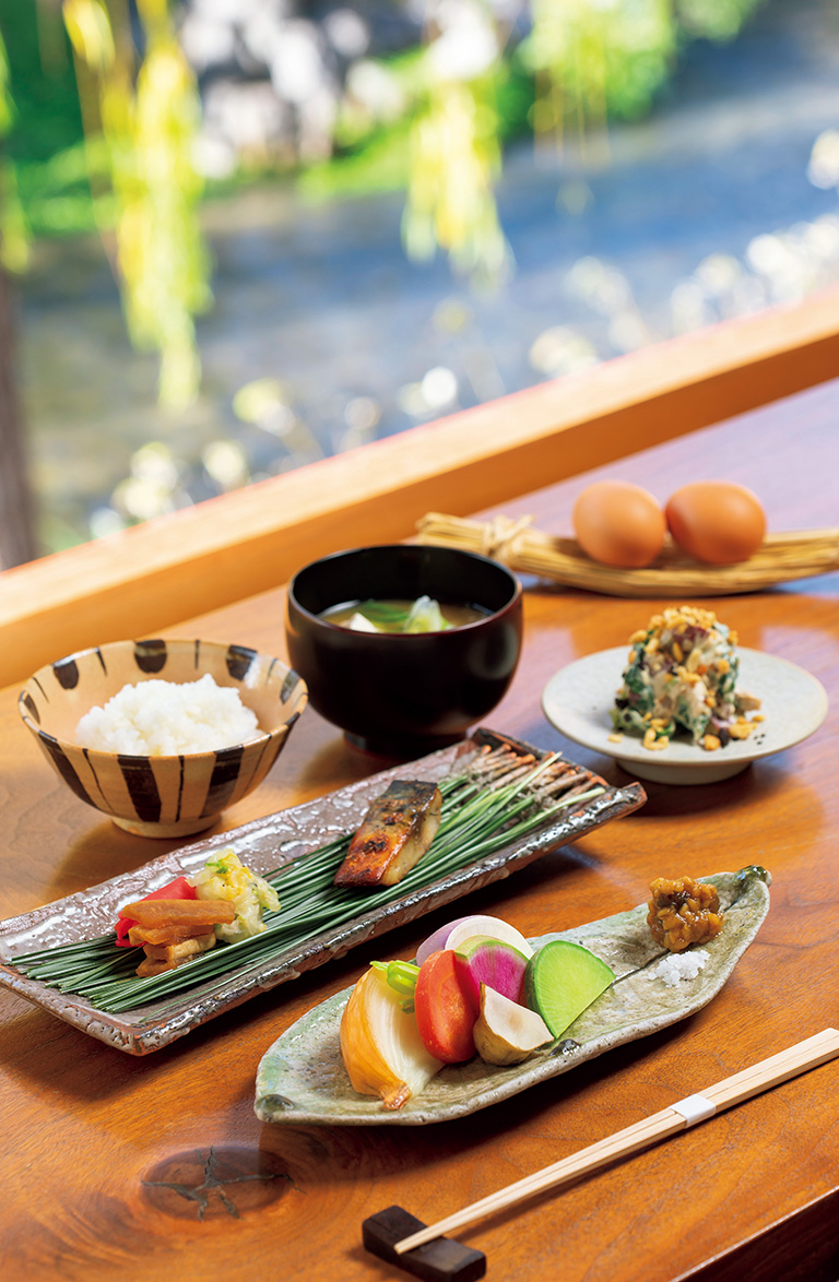 朝食は1種類。ご飯と味噌汁に丹後の蒸し野菜、季節の和え物、へしこの炭焼き、特別濃厚卵、自家製漬物などが並ぶ。一見家庭の食卓と変わらないようだが、たとえばご飯は丹後の自社田で社員自ら育てた米を土鍋で炊きあげたもの。蒸して、煮て、和えて、漬けてと多彩に供される旬の野菜は、丹後の農家が自然農法で育てたもの。