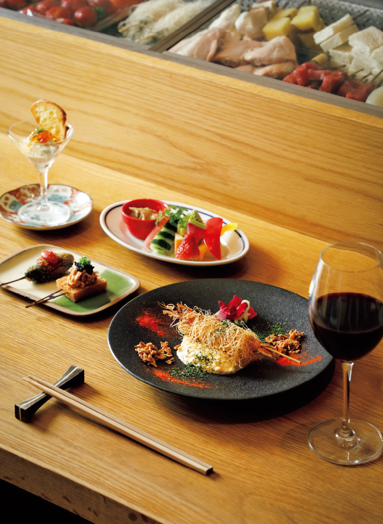 さらに串揚げの間に、カニ味噌のバーニャカウダ、ウニのムースなど、通常串カツ店では目にしない洒落た品々が挟まれ、コク・酸味など様々な風味と食感で飽きのこない仕立てに。合わせるワインも思わず進んでしまう。