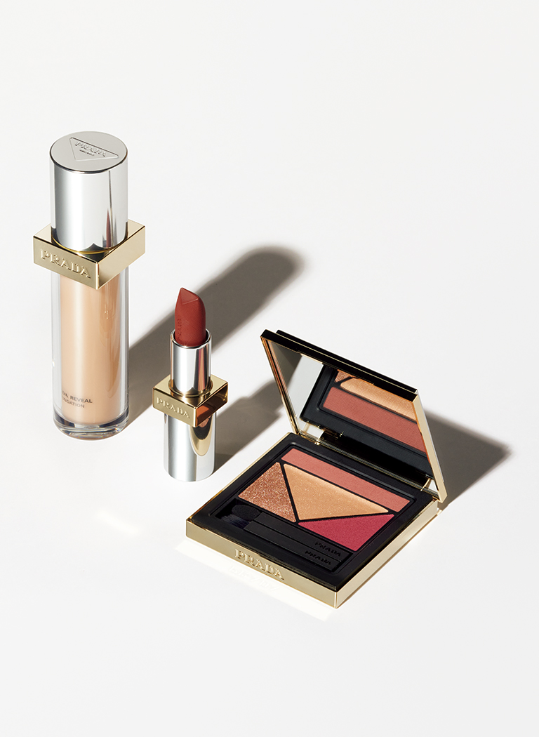 質感の異なる3色のニュートラルカラーにアクセントカラーを加え、ナチュラルもエッジの効いたメイクも自由自在。ミニマルで機能的、環境に配慮したリフィラブルパッケージも、プラダらしさの真髄といえる。