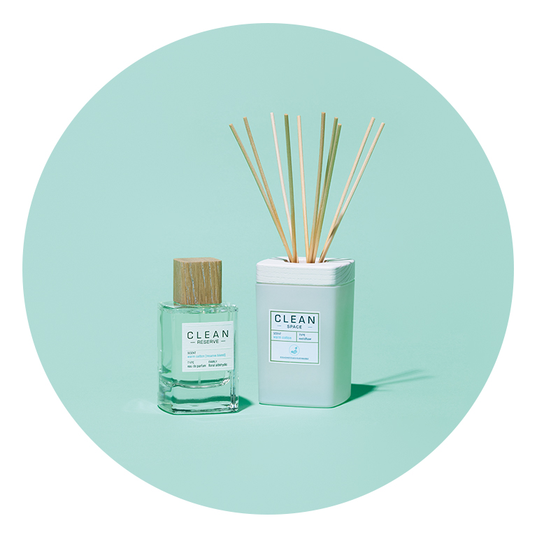 左:「クリーン リザーブ ウォームコットン オードパルファム」100ml 16,280円、右:「クリーン スペース ウォームコットン リードディフューザー」177ml 7,810円(共に税込)