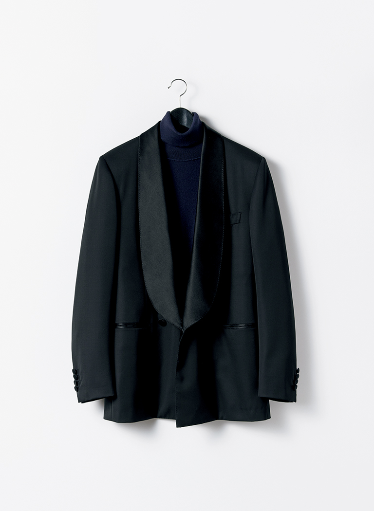 1952年、ブリオーニはフィレンツェのピッティ宮殿でラグジュアリーメンズブランドとして史上初のファッションショーを開催。伝統的メンズウェアの概念を覆す革新的作品を発信、世界的人気を獲得した。スーツは220の工程と7000もの隠れたハンドステッチが施され、全工程は100%イタリアで行われている。このジャケットのベースはバージンウールのバラシア、拝絹の光沢がハイゲージニットの上でしっとりと艶めく。