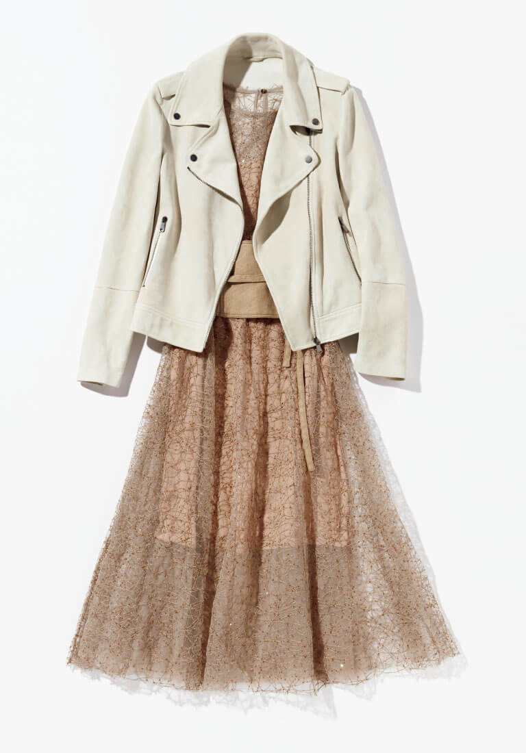 これはチュールに巧みなエンブロイダリーを施したドレス。ブルネロ クチネリは、エンブロイダリーを組み合わせたアイテムを得意としてきたが、今回はドレスにも転用。刺繍糸とそこに絡んだスパンコールが、ヌードカラーのチュールの上で美しいクラフトワークを見せているのだ。コルセットのようなオビベルトが付いていて、巻き方のアレンジは着る側に任せられている。アウターとして合わせたのはダブルスエードのバイカージャケット。