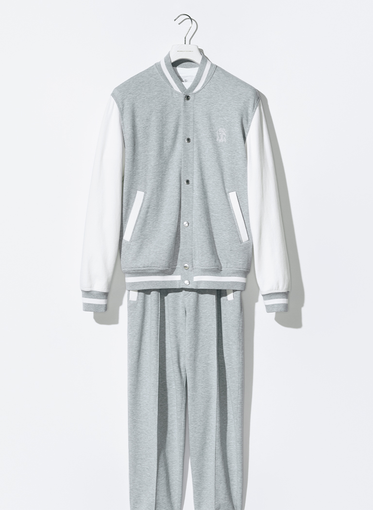 これはブルネロ クチネリのスタジアムジャンパーのセットアップ。淡いグレーとホワイトの配色がクリーンで品がいい。大人の男性に向けてデザインはシンプルに徹している。ジャンパーのインはシャツに、ボトムはデニムやチノに替えてもきれいにまとまる。素材はしなやかで肌触りのいい超長綿にポリアミドを7%混紡。軽く柔らかなジャージーの強度を高め、表面の毛羽立ちを抑えるためだ。