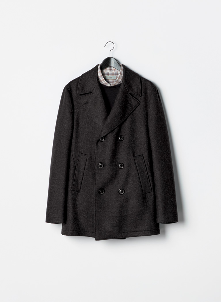 これはイタリアの名門、カナーリのピーコート。本来はネイビーの厚手メルトンを使用するが、このコートはピュアウールシルクのダブルフェイス地を採用、表面は落ち着いたチャコールグレー。