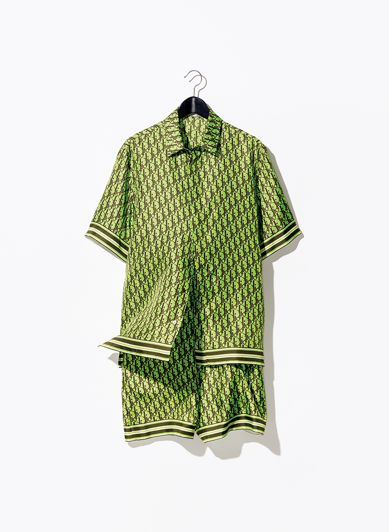 今季トレンドの蛍光グリーンに渋いカーキを組み合わせ、洗練されたカジュアルへと着地させた。フロントは比翼仕立て。マザーオブパールのボタンを閉じれば、前身頃はぴたりと柄が合う。