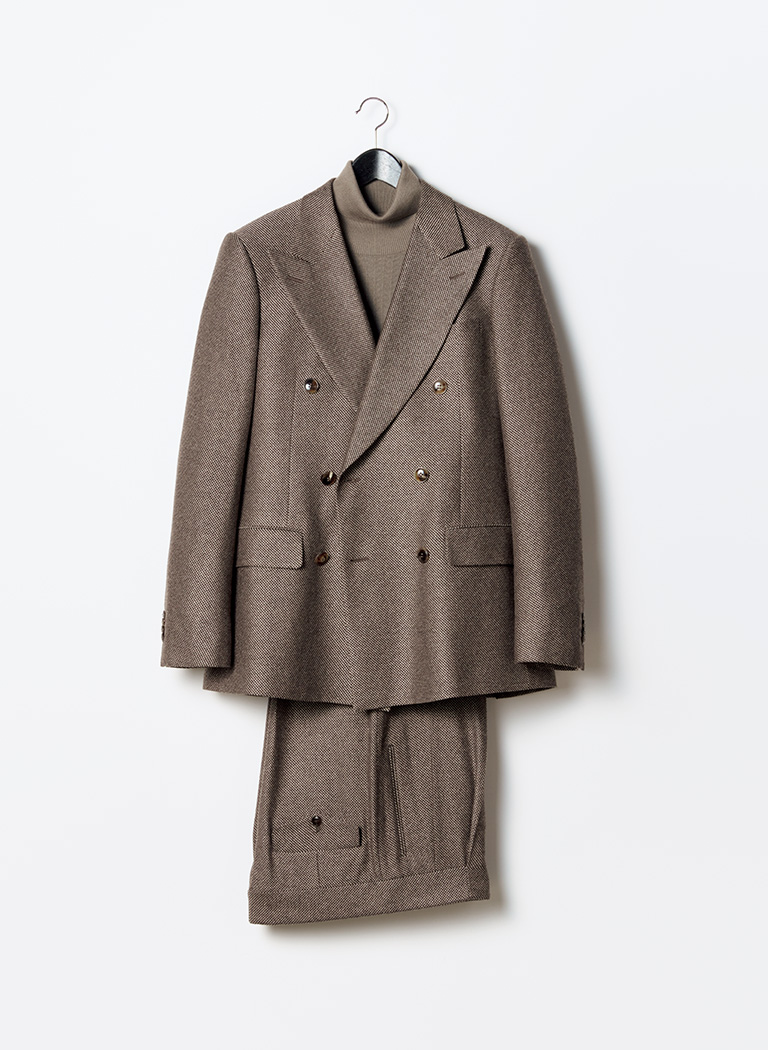 ピークトラペルの先端からボタンまでを描くカーブが絶妙。端正な仕立てや穏やかな色調からオーセンティックな雰囲気が漂うが、生地の軽く柔らかな風合いがカジュアルなスタイリングも可能にしている。きりっとした肩、ソフトな身頃、ゆったりとしたパンツまで、すべてが新しくて心地いい。