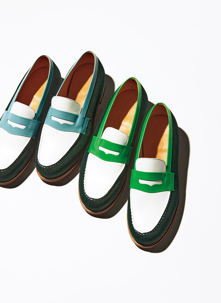 ダークグリーンのスエードとホワイトカーフのコントラストの上に、サドルとテープのライトブルーやグリーンが明快に映える。スリーシェイドの爽やかさが最大限に発揮されたローファーは夏の足元として完璧だ。
