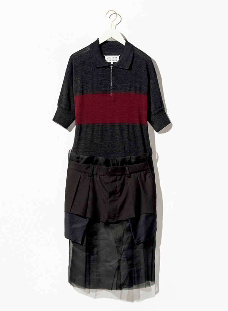 ポロ風ニットと、スカートはマスキュリンな素材とシアーな素材の組み合わせ。誰もが慣れ親しんだニットを起点に、デザインもテクニックも秀逸なドレスへと発展させている。