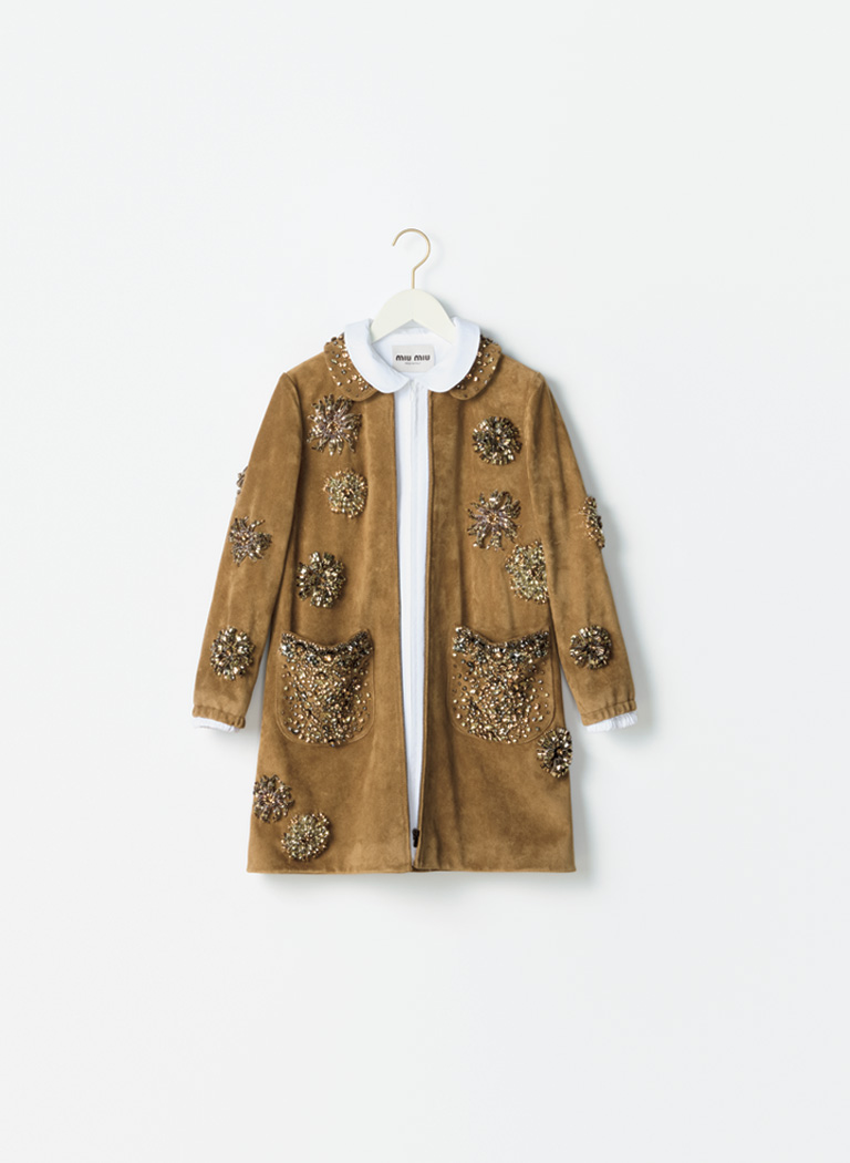 丸襟のキュートなスエードジャケットに施されたラインストーンのフラワーモチーフは今季、ほかのアイテムにも多用されたディテールだ。