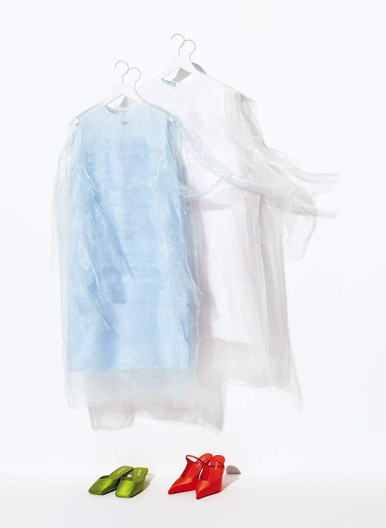 シアードレスはほかにピンクとベージュも。ベースのドレスはリナイロンを使い、胸元にはプラダの三角ロゴ。各色とも同色の極薄オーガンザの3枚重ね。コレクションではヴィヴィッドカラーのサテンシューズを合わせていた。