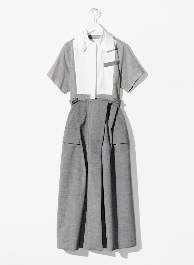 サカイというブランドは、このハイブリッドなクリエイションが核となっている。今季はシャツやジャケット、コートなど、スタンダードなアイテムを独自のバランス感覚で再構築したドレスが多く登場。このドレスも全体はゆったりとしたフォルムだが、ディテールには手の込んだクチュールの技法が用いられている。上半身はプラストロンのシャツを基本に、ドレスシャツの襟にタキシードのようなサテンのカラーを重ね、胸に箱ポケットを付けている。このシャツに重ねるように比翼仕立てのコートの下半分をスカートに転用、こちらはアウトポケットとセンターベントで軽快な仕立てだ。
