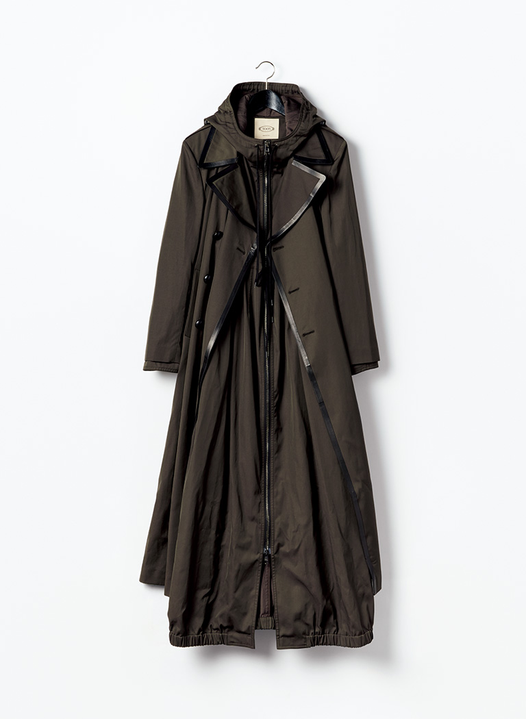今季を象徴するコーディネートがカーキ色のパーカードレスとロングトレンチ。スポーツとミリタリーのハードなミックスから現代的なエレガンスを引き出している。フロントをダブルファスナーが走るパーカードレスは、ウェストをダーツとドローコードで絞り、フェミニンなフォルムを誘導。