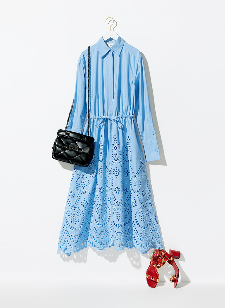 色は上品なライトブルー。爽やかさをまるごとデザインしたかのようなこのドレスは、ヴァレンティノのプレフォールコレクションから。シャツ部分のフロントはフォーマルな印象の比翼仕立てですっきりと仕上げ、ウェストにはカジュアルなドローストリング。