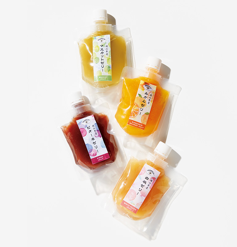 1玉ずつ袋掛けして、強い日光をあえて当てずに丹念に栽培したものを使っている、芳潤な香りの白桃ゼリー。生産量日本一を誇るマスカットを搾汁し、豊かな香りと酸味を特徴としたマスカットゼリー。水はけのよい石灰質の土壌で栽培され、甘みと酸味がみごとにバランスを取っている大玉のピオーネゼリー。無農薬栽培の温州みかんを使い、みずみずしい風味を大切にしたみかんゼリー。