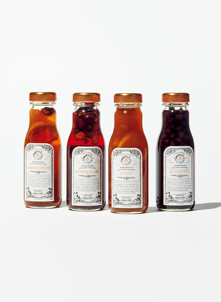 いずれも砂糖不使用で、ビネガーの風味も凛としている。水で5~10倍に希釈する、炭酸で割る、お湯割りにする、牛乳を加え、よく混ぜて飲むなど、楽しみ方はさまざま。健康促進や美容全般にも効果的であることは改めて書き記す必要もないだろう。