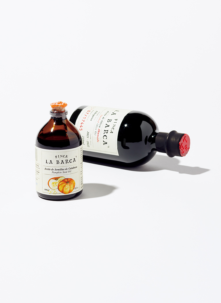 「フィンカ・ラ・バルカ」の燻製オリーブオイルは、年間に13,000~17,000本のみ製造。パンプキンシードオイルは、ペポカボチャが原材料。その種には抗酸化物質が豊富に含まれている。こちらも数量限定品。