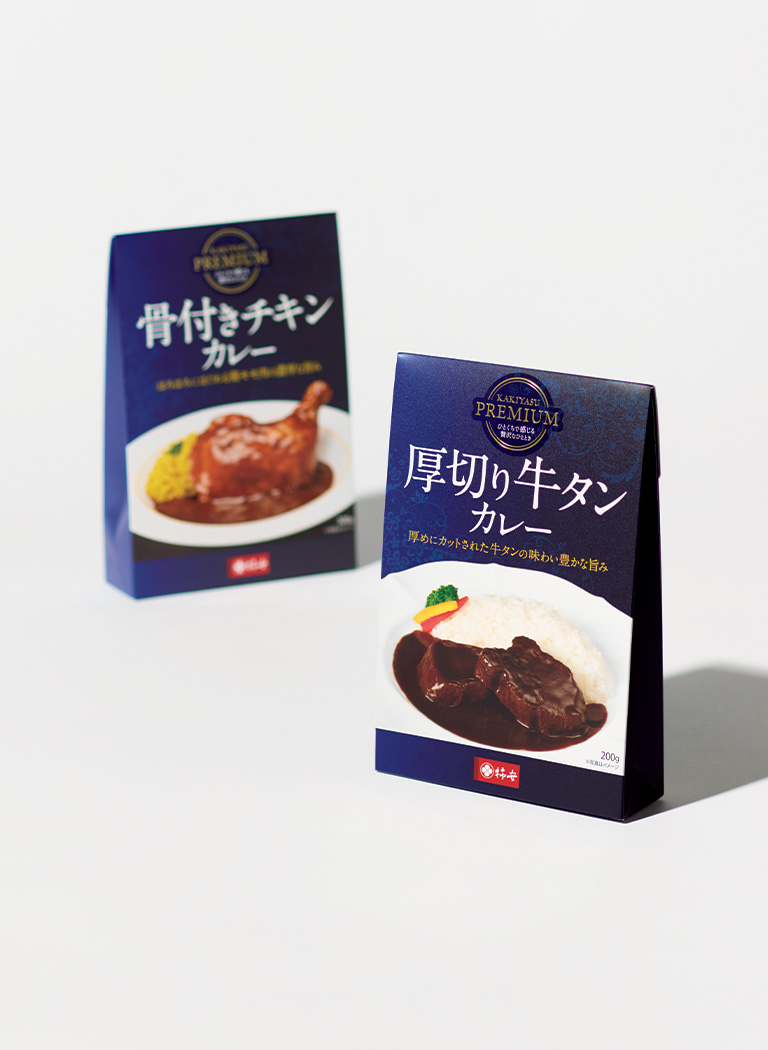 右:「KAKIYASU PREMIUM 厚切り牛タンカレー」200g 2,700円