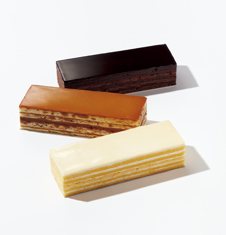 上から順に、カカオの豊かなコクとほのかな薔薇の香りを漂わせた「チョコレートとローズの生ケーキ」。香ばしいヘーゼルナッツを極限までたっぷりと使い、塩味のほろ苦いキャラメルと絡めた「キャラメルとヘーゼルナッツの生ケーキ」。幅広い年齢層に好まれているリッチなミルクやクリームなど、白く、甘く、柔らかなイメージを元に、丹念に仕上げた「バニラクリームの生ケーキ」。人と自然の、美しい調和。