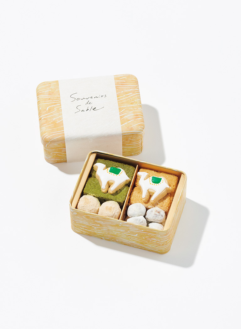 中身は、店内工房で作られた2体のラクダを形にしたクッキーと、県産の最高級抹茶を使ったサブレやバニラサブレ、ほうじ茶ときなこのブールドネージュもここに加わる。缶を開けた時の楽しくハッピーな驚きと、それぞれをつまんで口に運んだ後の幸せな体験が相まって、忘れがたい一品となること間違いない。