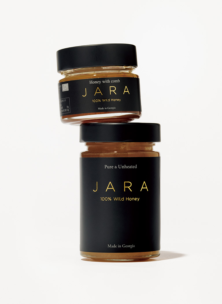 写真の品は日本初上陸となったジョージアの希少はちみつ「Wild JARA Honey(ワイルド ジャラ ハニー)」。JARAとは、木で作られた蜜蜂の棲家を指す。環境汚染のない海抜1200メートル級の崖沿いや高い木の上に設置され、収穫は年に一度。年間でも1000本程度、はちみつ市場のわずか0.1パーセントしか流通しない。