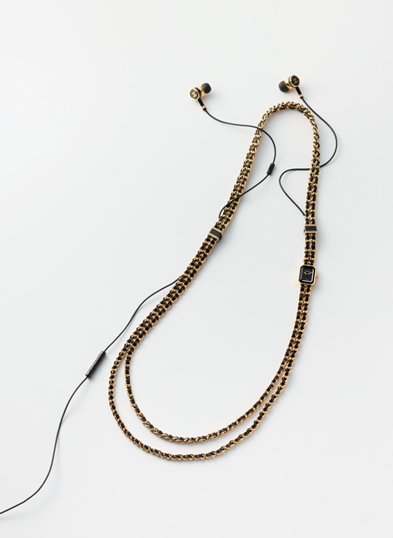 ウォッチ部分は初代「プルミエール」のエレガントな佇まいを踏襲しているが、ブレスレットはロングネックレスへ、そこにオーディオデバイスを装着する大胆で現代的な仕様だ。