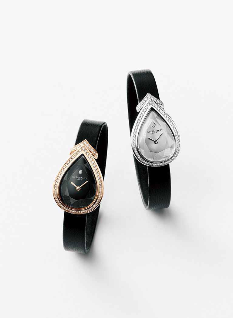 3月に新発売されたペアシェイプ型ケースの「ジョゼフィーヌ」コレクション エグレット ウォッチは、名門ジュエラーならではのていねいな鏡面仕上げで、ベゼルにセットされたブリリアントカット・ダイヤモンドは、プレシャスそのもの。実はショーメの時計づくりには、1811年製の時計が確認されるほどの伝統があり、その技術には定評がある。
