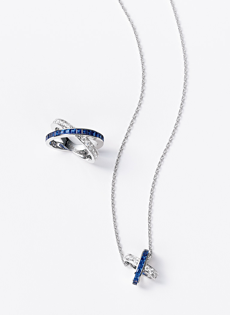 その「リアン」のアイコンであるクロスモチーフを立体的に表現した「ジュ ドゥ リアン」にフレッシュなリングとペンダントが新たに加わった。ラウンドブリリアントカットのダイヤモンドにスクエアカットのサファイアがシャープで軽やかにクロスする、清々しい、ユニセックスでも楽しめそうなジュエリーだ。