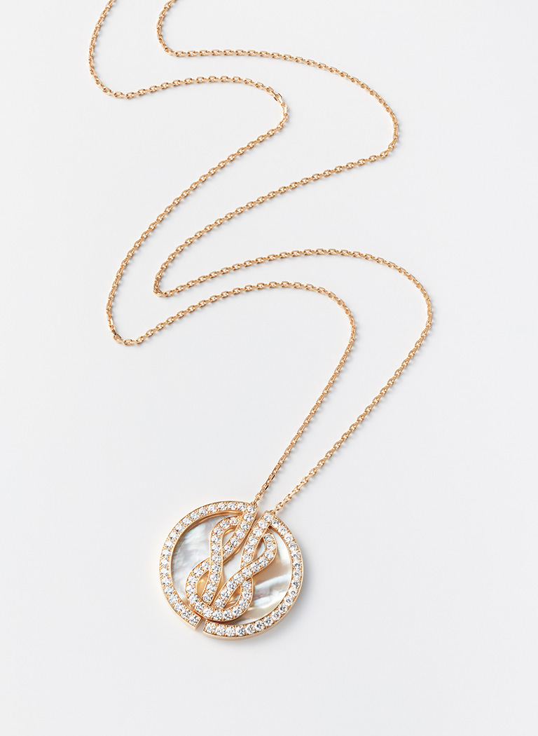繁栄の象徴とされるマザー オブパールの直径40ミリの丸い柔らかな光の中に、シャンス アンフィニを意味するレムニスケート(連珠形)のダイヤモンドのダブルボウが描かれている。燦然と輝くそのラインをたどると、外周を巡って元に戻る。入念にセットされたブリリアントカットのホワイトダイヤモンドが85粒。幸福を呼ぶオーラのある永遠回帰ロードだ。
