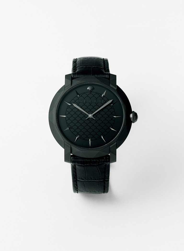 リュウズにはブラックダイヤモンドがあしらわれ、文字盤面にはグラフを象徴するアイコニックパターンの微細な表現が。世界の王族、セレブリティに愛されるジュエラーのエレガンシーが横溢、スリムな黒い感性にうたれる。