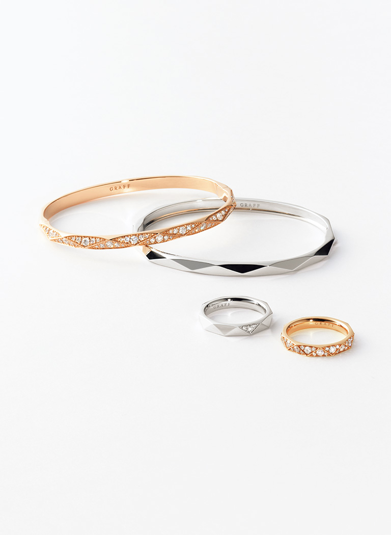 グラフのシンボルであるダイヤモンド。そのファセットを思わせる立体的なデザインを施したメタルバージョンと、パヴェダイヤモンドをセットしたダイヤモンドバージョンの、2つのデザインが揃う。