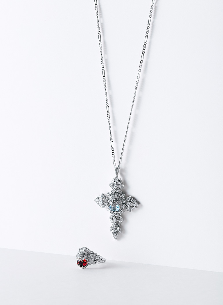 厳選された素材とていねいな細工。表面の平滑性、細部の仕上げなどに熟達の技が光る。ネックレス:WG、ダイヤモンド、アクアマリン、チェーン70㎝。リング:WG、ダイヤモンド、ガーネット、サイズ9から15。ネックレスは『グッチ銀座』限定発売、リングは全国の厳選されたグッチショップにて発売中。