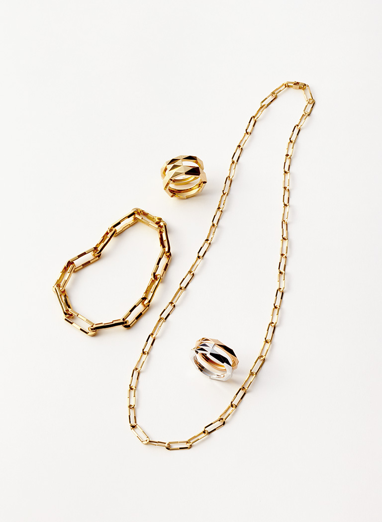 イエロー、ホワイト、ピンクの3種類の18Kゴールドをベースに、リング、ブレスレット、ネックレスなどを展開している。スリークで幾何学的なデザインは1980年代のスタイルを彷彿させ、モダンにして軽快だ。