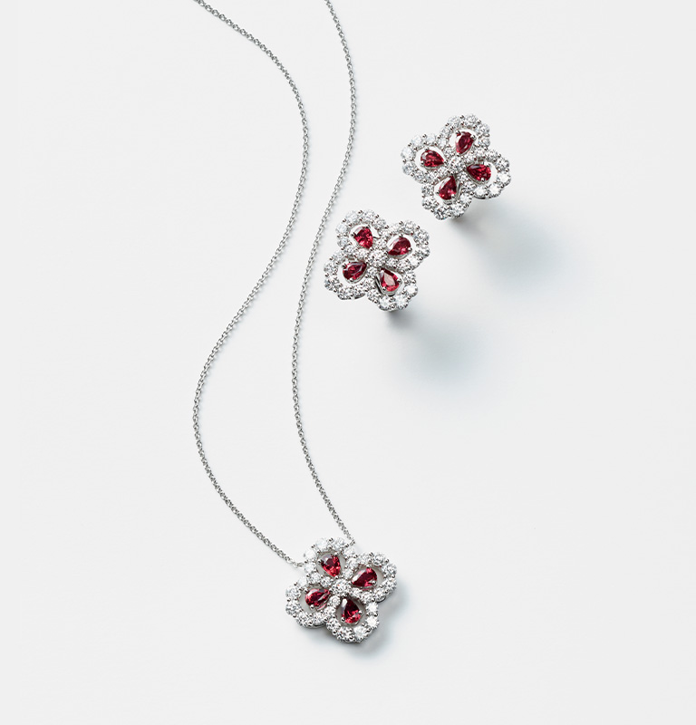 ダイヤモンドの燦光に真紅のルビー。身につける人の心に寄り添うコレクション。ペンダント:ルビー4個計約0.94ct、ダイヤモンド29個計約1.33ct、イヤリング:ルビー8個計約1.58ct、ダイヤモンド58個計約2.67ct。すべてブランドの厳格な基準をクリア。全国ハリー・ウィンストン直営サロンで発売中。