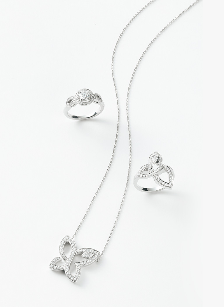 写真上のエンゲージメントリングの中央に配置されたラウンド・ブリリアントカット・ダイヤモンドの存在感ある輝きには、自然美と優雅さが。写真右中の、1個のマーキースカットと54個のラウンド・ダイヤモンド(計約0.41ct)からなるリングと、新作のペンダントとの組み合わせも優美だ。人生の大切な時間を彩る、満開のユリの花、「リリークラスター」に浸りたい。