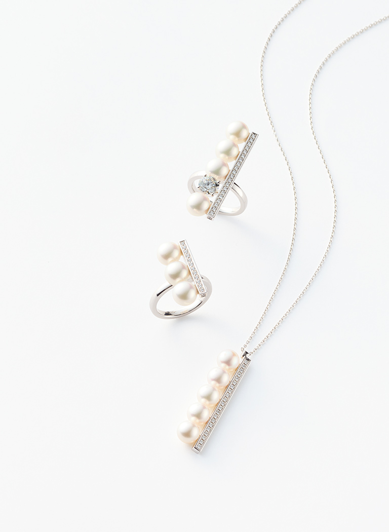 TASAKIの養殖場で丹念に育てたあこや真珠と、ダイヤモンドが共演する「balance plus」のラインナップ。写真の商品はすべてホワイトゴールド。