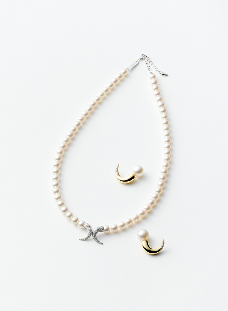 ネックレスは、直径約6.5ミリのあこや真珠の連なりが首回りに優しく寄り添う。トップには背中合わせの2本の尖鋭なホーン。その表面にパヴェセットされたダイヤモンドの眩さと、上質なパールから溢れ出る“照り”の調和が心地よく、スタイリッシュでモダンでもある。