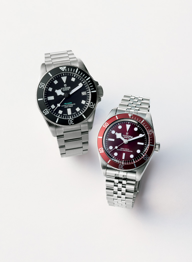 左はプロユースを想定したモダンダイバーズの最新作であり、チューダー史上最強となる1000メートル防水を実現した、その名も「ペラゴス ウルトラ」。頑強なケースは43ミリと大ぶり。しかしブレスレットも含め、チタニウム製とすることで軽快な装着感をかなえている。
