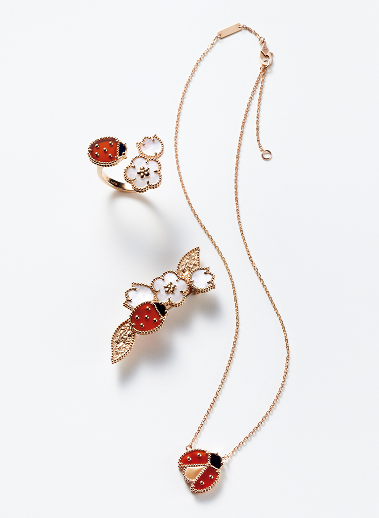 ジュエリーのバリューは素材の良さと作り手の美への敬意、創造への献身で決まる。このサヴォアフェール(創造性と技)とメゾンが大切にする自然との融合が相まって、「ラッキー スプリング」は春の喜びと詩情に満ちあふれ、幸福ジュエリーとして開花している。