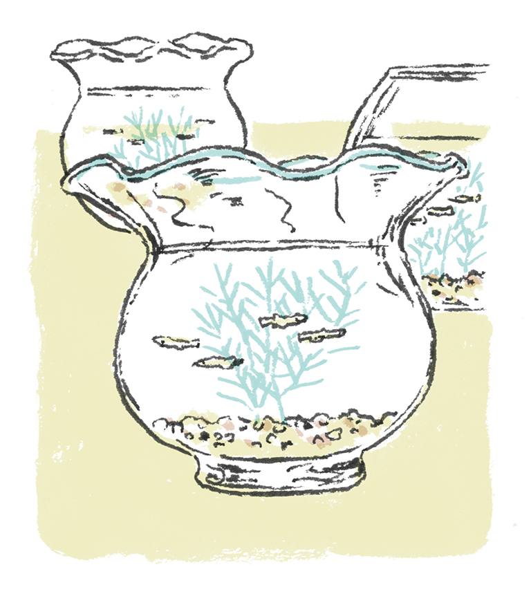 今の世の中、より多くの人とSNSで繋がろうという意識が強くあるけれど、金魚鉢の中のメダカは自分たちだけの世界で幸せそう。グローバル化の本質をメダカに考えさせられる……なんともおかしな話です。