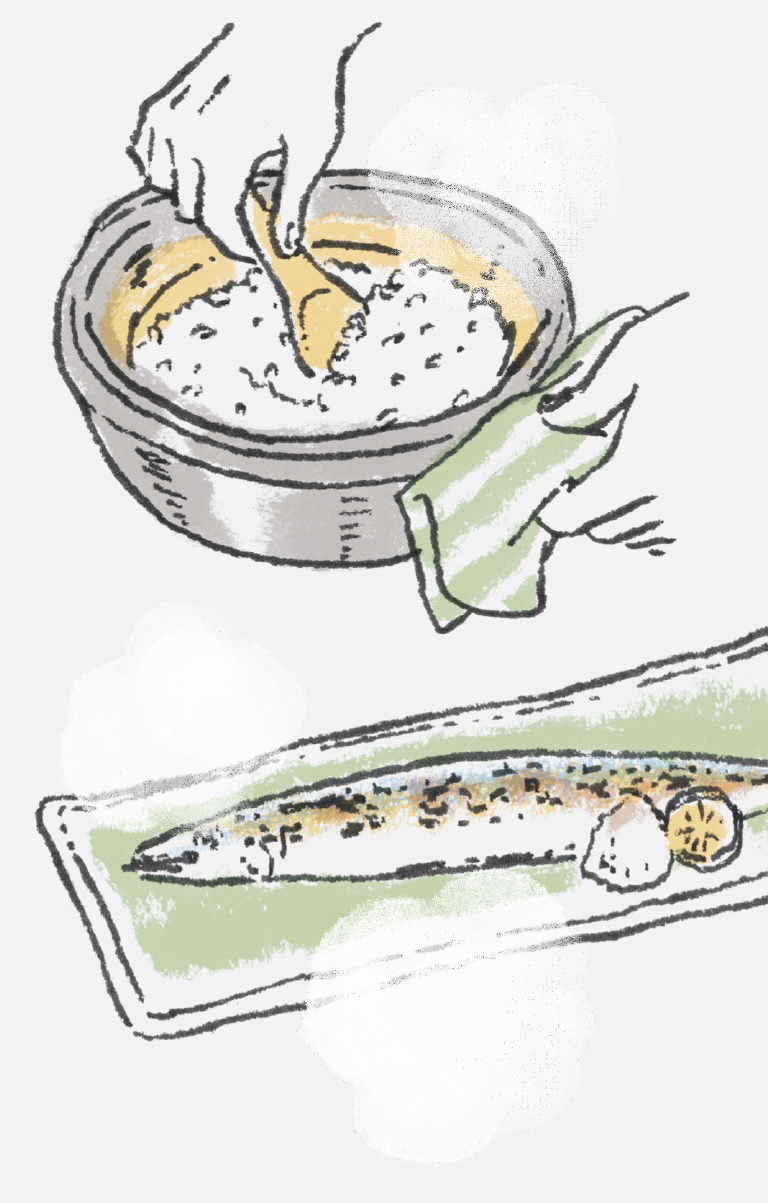 旬の焼き魚と土鍋で炊いたご飯。
